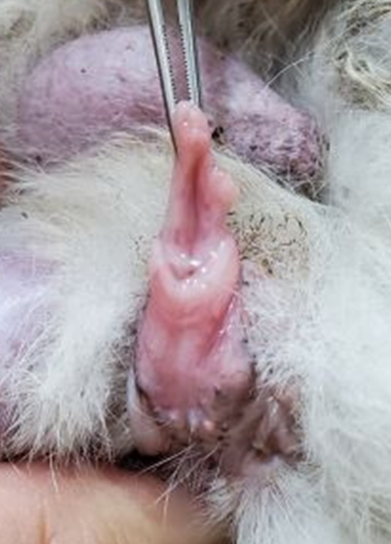 ウサギにおける陰茎裂(Split penis:スプリットペニス)は、臨床的には尿道下裂(Hypospadias)として知られる病態です。これは雄性生殖器の腹側(陰茎の下面)において、尿道の形成が不完全になる先天性の異常を指します。通常、尿道は陰茎の先端である亀頭まで到達していますが、この異常がある場合、本来の開口部である外尿道口が陰茎の腹側のどこか、あるいは極端な例では会陰部に位置することになります、尿道口が縦に裂けています。尿道下裂はヒトの小児科学でよく見られる先天異常の一つですが、獣医学領域、特にエキゾチックアニマルの診療においても、あらゆる品種のウサギで発生が報告されています。この病態の本質は、胎生期における尿道溝の閉鎖不全、および前部尿道を形成する組織の発達不全にあります。重症度によって、見た目のわずかな違和感から、排尿障害、不妊、さらには性分化疾患を疑わせる複雑な状態まで、様々な症状を示します〔van der Hors et al.2017,Baskin et al.2006,Halaseh et al.2022〕。