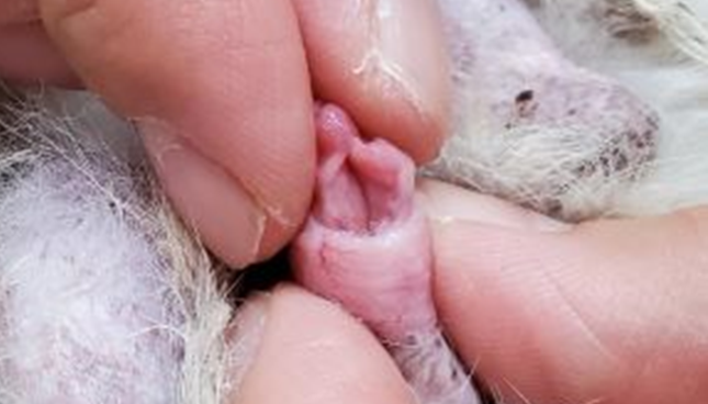 尿道下裂を深く理解するためには、正常な雄ウサギの解剖学的な特徴を知ることが欠かせません。ウサギの体は他の家畜やペットと異なる点が多く、それが診断や合併症の理解に直結するからです。正常な成体のオスのウサギは、円錐形の亀頭を持ち、その先端に丸い外尿道口があります。陰茎は包皮(Prepuce)で完全に守られており、去勢していない成体であれば、下腹部を優しく押すことで陰茎を露出させることができます。尿道下裂がある個体では、この時に腹側の裂け目や、包皮が不完全な形であることが確認されます。包皮は本来、陰茎をぐるりと覆っていますが、尿道下裂の場合は腹側の融合がうまくいかないため、背側と側面だけにフード状に存在することがあります。これはヒトの症例で見られるHooded prepuceと同じような状態です。