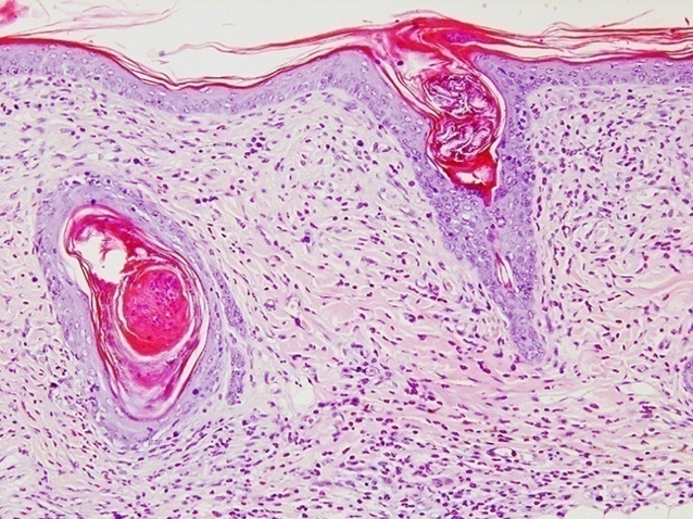 確定診断の一助として行われる皮膚生検では、アレルギー性疾患に特徴的な血管周囲性皮膚炎のパターンが観察されます 。病理学的検査において観察される主要な所見は、海綿状態(表皮細胞間の浮腫による隙間の拡大)、表皮肥厚(慢性的刺激による表皮の層の増加)、細胞浸潤(真皮の血管周囲を中心としたリンパ球、組織球、および好酸球の浸潤)、表皮内微小膿瘍(好酸球が表皮内へ遊走し、小さな集塊を形成)などです〔Palmeiro et al.2019〕。