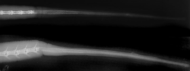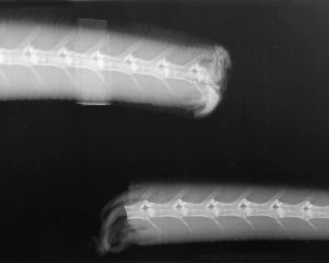 犬や猫で行うような断尾手術は椎骨間の切断(椎間板切除術)ですが、このよう方法を爬虫類で行うと離断面を失うために尾は適切な再生されず、尾が小さかったり、複数の尾が生えることもあります。