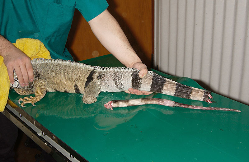 尾の自切をするトカゲにおいて、尾の炎症や壊死、腫瘍などが起こると切断手術を行います。しかし、犬や猫で行うような尾椎を離断する術式でなく、椎体の離断面に力を加えて、自らの自切と同じ現象を起こすことで離断させます。基本的には無麻酔で行いますが、暴れる個体などでは局所麻酔や鎮静を施すこともあります。