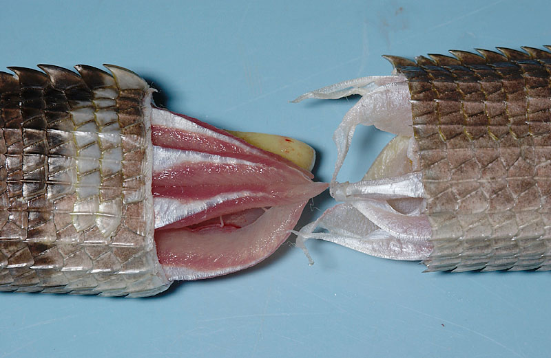尾椎の腹側に血液とリンパ管が見られます。尾椎動脈は椎骨に近いところを走行し、尾椎静脈は動脈の腹側に位置し、動脈と静脈の両側に1対の大きなリンパ管があります〔lepen et al.1995〕。尾椎には予め形成された骨折線(離脱面)があり、この部分が離開することで自切します。