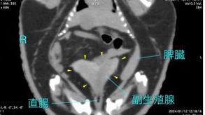 理論的に精嚢腺は超音波検査で明確になると思われますが、内臓領域とも重なることから、CT検査が最も診断に有用です。精嚢腺の拡大や軟化・硬結などが認められ、炎症などが潜在していると診断されます。