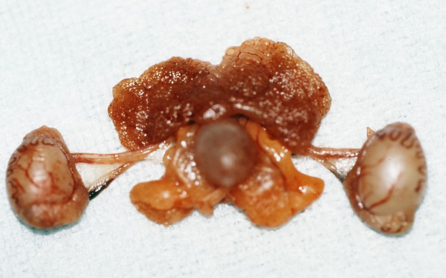 ハリネズミでは血尿の原因の一つに、精嚢腺過形成および炎症があげられ、精嚢腺はアンドロゲンに依存している可能性が高いです。もちろん、泌尿器の結石や炎症を除外する必要があります。しかし、近年になりハリネズミの精嚢腺疾患の報告も増え、巨大な嚢胞形成の例などもありまする〔Wooten et al.2022〕。