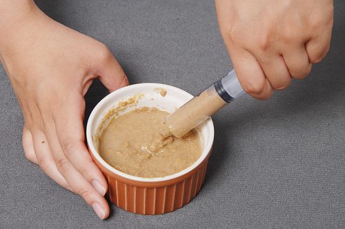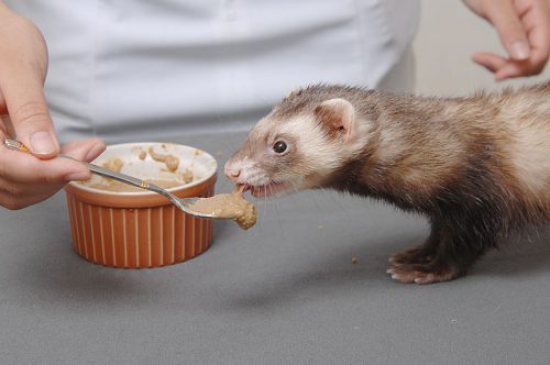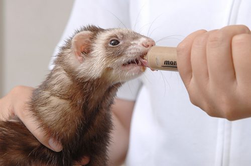 高タンパクの食材をなるべく頻回に与え、状態によってはシリンジなどを用いて強制的に与えます。フェレット用の流動食が販売されているので、粉状の製品をふやかして与えます。特に寝起きや運動後にはなるべく行ってください。