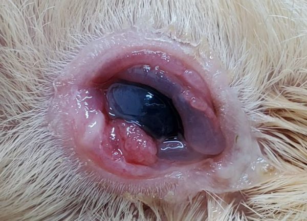 「モルモットの目が赤い」という主訴は結膜炎であることが多いです。しかし、結膜炎の原因は呼吸器感染症、牧草や粉塵の迷入、喧嘩などの外傷、そして細菌やクラミジアなどの感染が原因になります。モルモットにおけるアレルギーの発生報告はありませんが、一部では実験動物モデルが作られ、点眼薬の薬効研究に利用されています〔Nabe et al.2013〕。眼瞼結膜や眼球結膜の血管が怒張し、結膜の浮腫まで起こすこともあります。