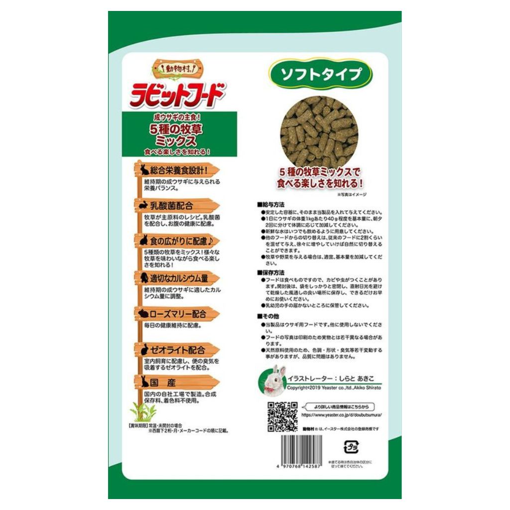 5種類の牧草を配合することで、ウサギの食の広がりに配慮!5種の牧草を主原料に、オリゴ糖と乳酸菌を配合することでお腹の健康維持に配慮。