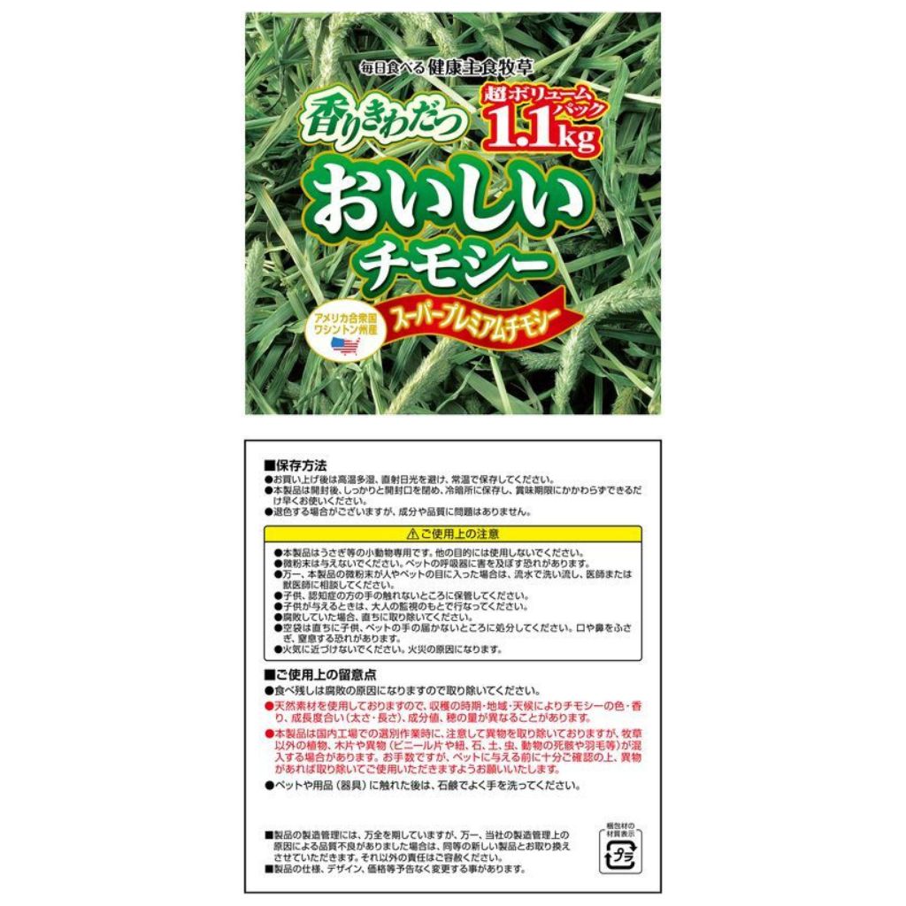 ・天然素材を使用しておりますので、収穫時期、地域、天候によりチモシーの色、香り、成長度合い(大きさ・長さ)、成分値、穂の量が異なることがあります。
