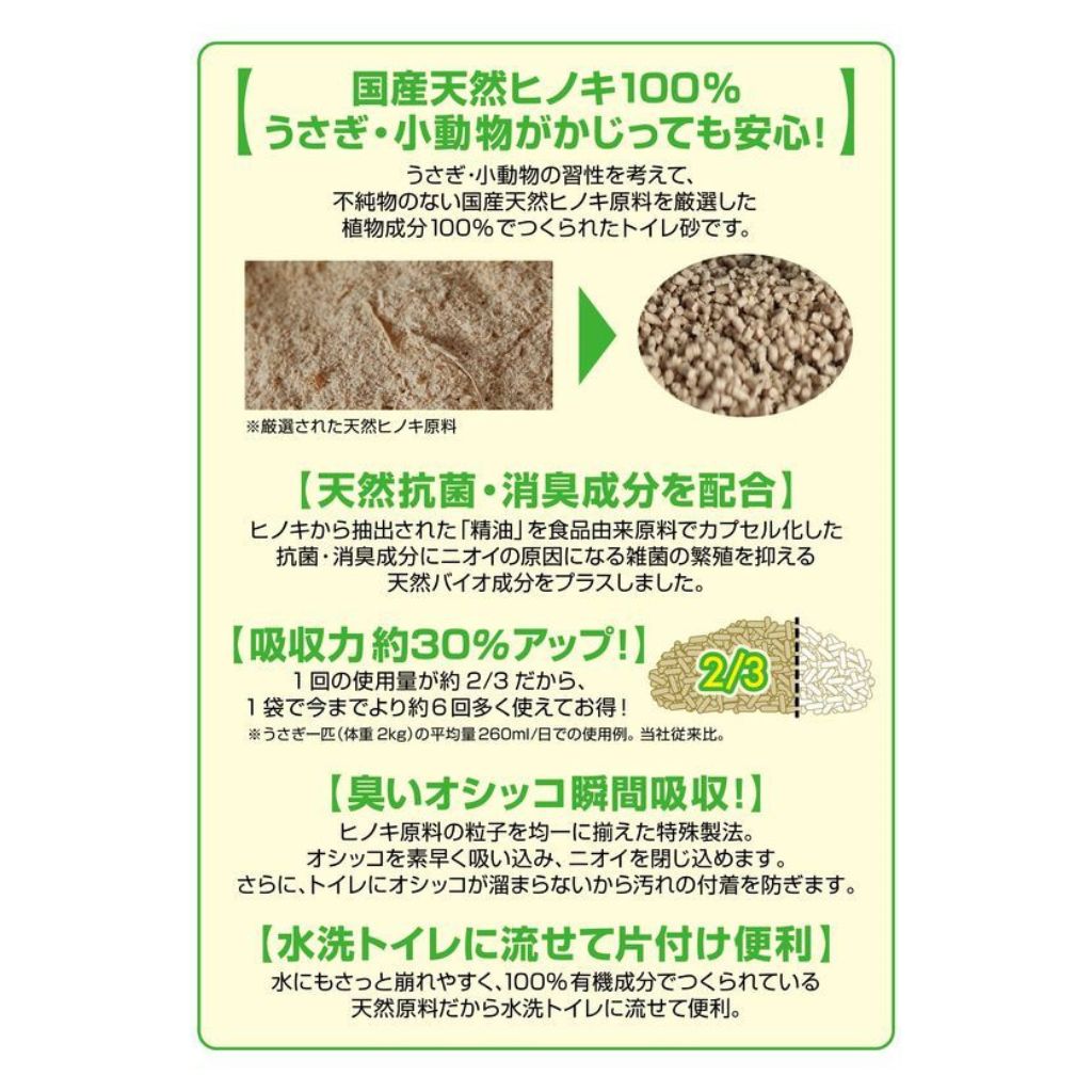 爽やかな香りでトイレの嫌なニオイを瞬間消臭!■国産天然ヒノキ100%うさぎや小動物の習性を考えて、不純物のない国産天然ヒノキ原料を厳選した植物成分100%で作られたトイレ砂です。