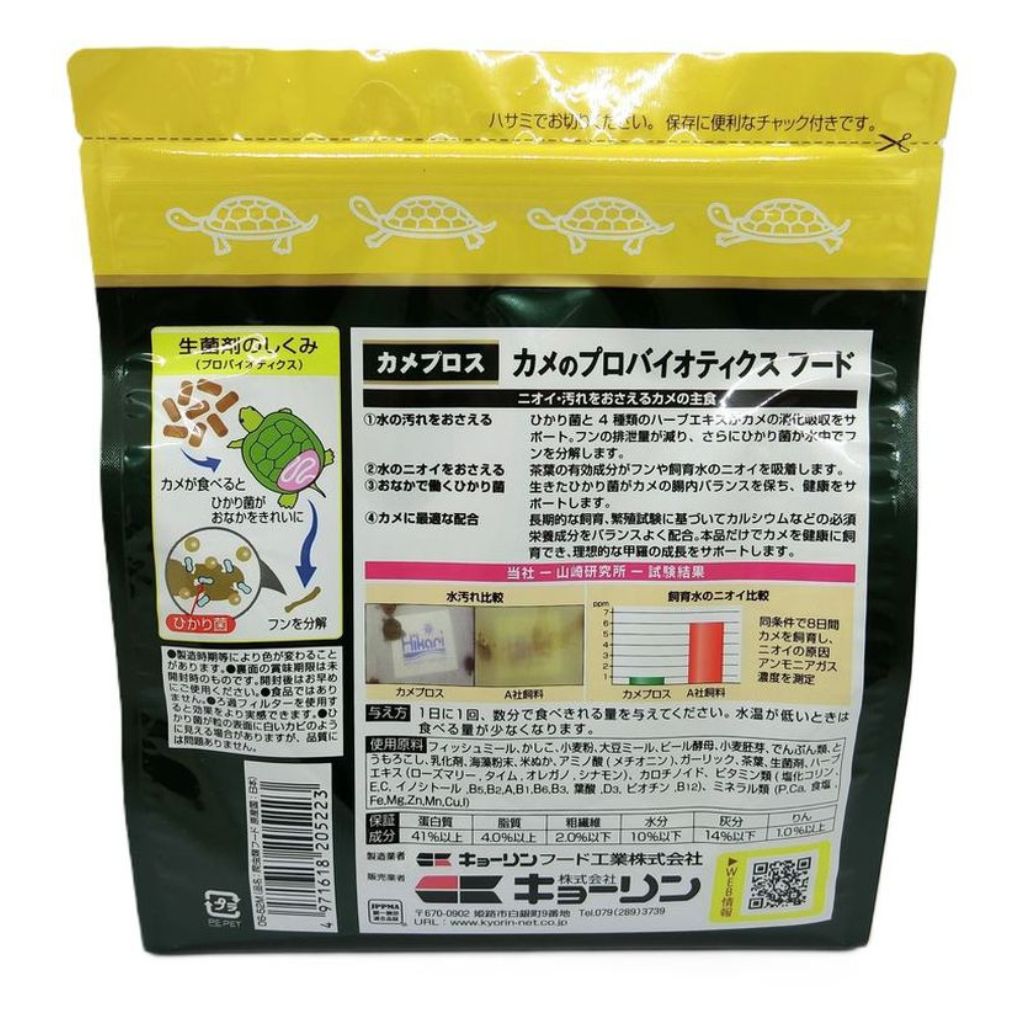“ひかり菌”と茶葉の効果で水の汚れと臭いを抑えるカメの総合栄養食です。