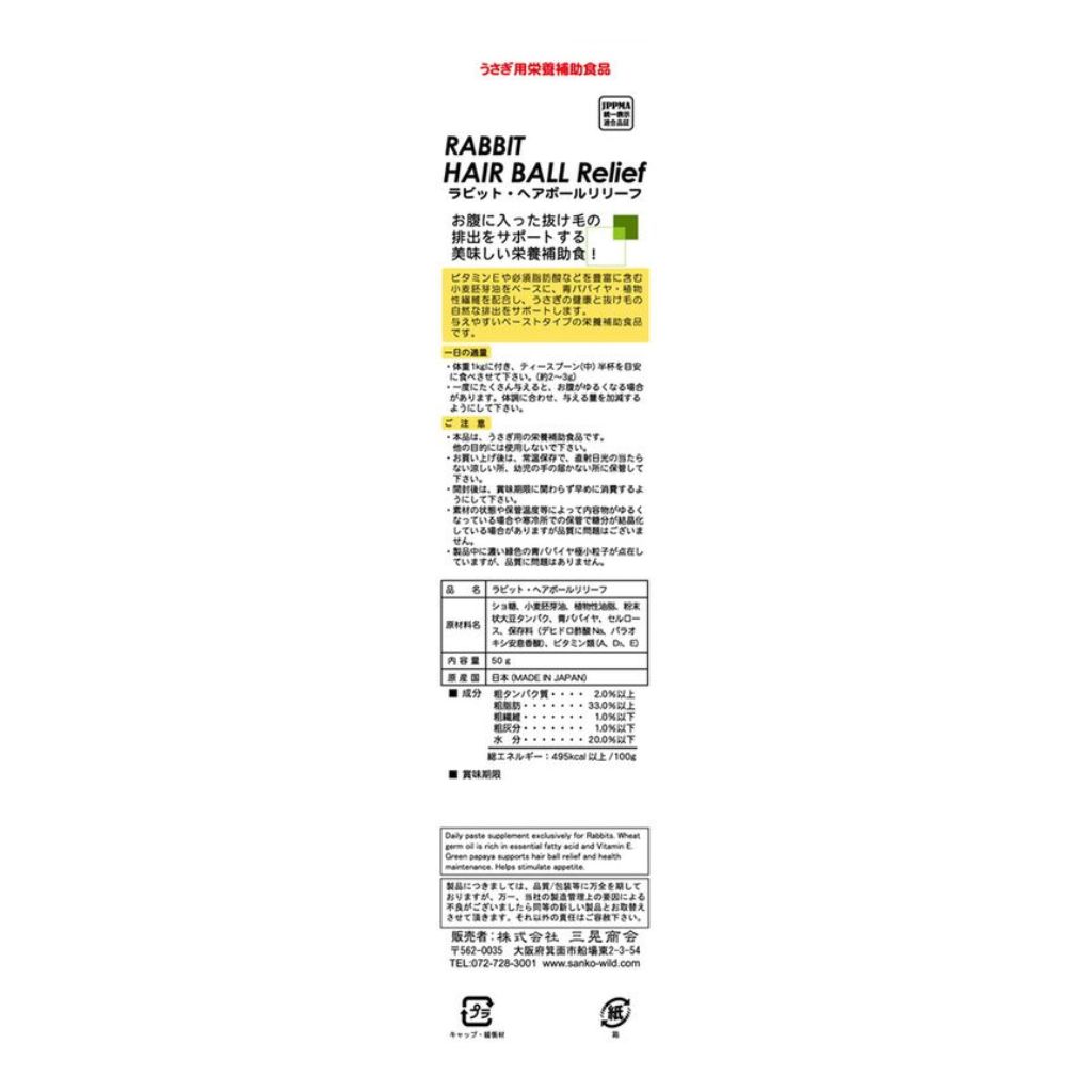 天然ビタミンを豊富に含む小麦胚芽油をベースに青パパイヤ、食物繊維を配合しうさぎ達の健康とお腹に入った抜け毛の排出をサポート。