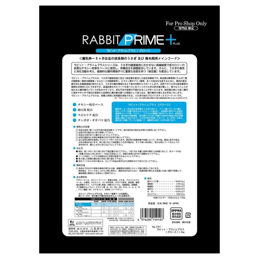 離乳期~8ヶ月ぐらいまでの成長期のうさぎに向けて、アミノ酸バランスに優れ、消化しやすい栄養が含まれるスピルリナを配合し、成長期の体作りに必要な植物性タンパク質、ビタミン、ミネラルが豊富に含まれています。