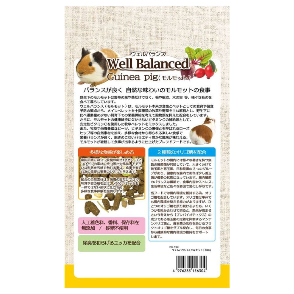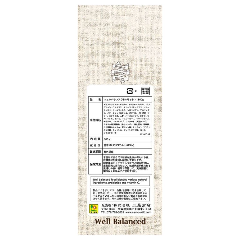 ・ウェルバランスはモルモット本来の食性とペレットとしての食育や偏食予防の観点から、メインペレットを十数種類の牧草や野草を主な原料とし野生化に比べ運動量の少ない飼育下での栄養供給を考えて穀物類を抑えた配合をしています。